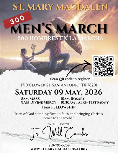 The 300 Men’s March is a gathering of men who want to grow in their faith and stand together as leaders in their families, church, and community. Men from across the city will come together for Mass, prayer, and fellowship. The morning will include the Divine Mercy Chaplet, the Rosary, and talks and testimony meant to encourage and strengthen men in their walk with Christ. Open to all men—including veterans, active-duty service members, fathers, sons, and those seeking to deepen their faith—this event is an opportunity to stand shoulder to shoulder with other men committed to living their faith with courage and conviction.
